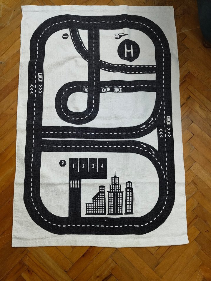Bu çocuk halısı, siyah ve gri şehir yolu desenine sahiptir; binalar, park yerleri ve helikopter pisti içerir. Eğlenceli bir oyun alanı sunar. ️