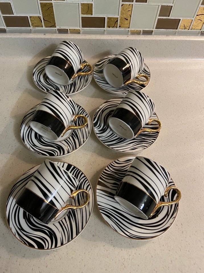 Altı adet kahve fincanı ve tabağı, siyah beyaz dalgalı desenli ve altın renk kulplu şık tasarım. Kahve sunumu için ideal. ☕