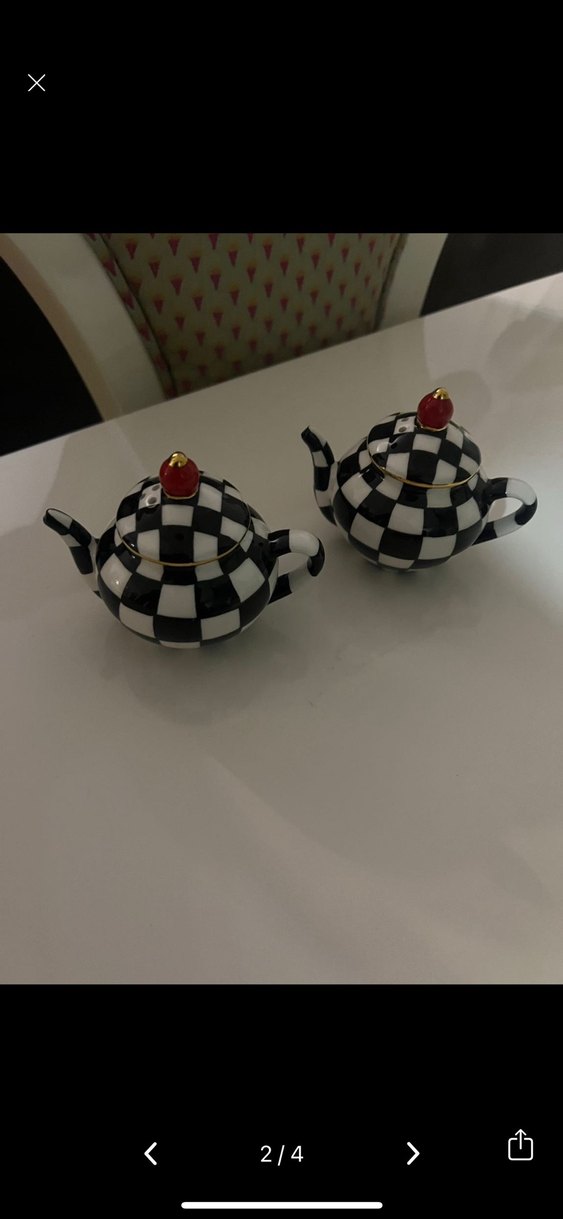 Üzerinde siyah beyaz damalı desen bulunan, kırmızı kapaklı iki küçük çaydanlık şekilli tuzlukseti. porselendir mackenzie orjinal kutusu ile gönderilecektir.
