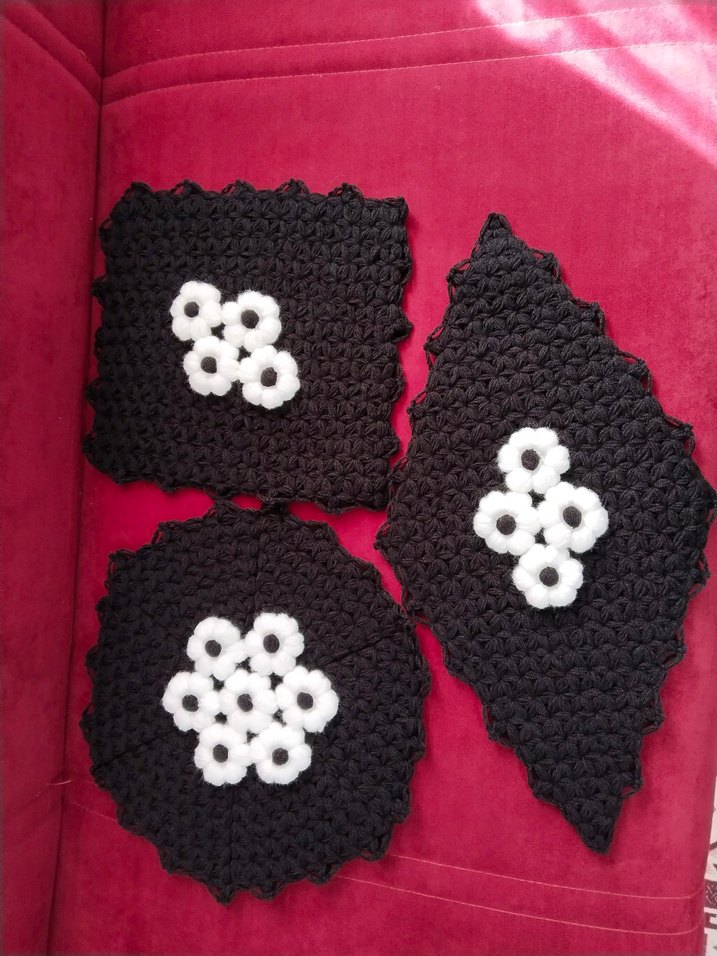 Üç farklı şekle sahip, siyah ve beyaz çiçek desenli banyo lif seti.