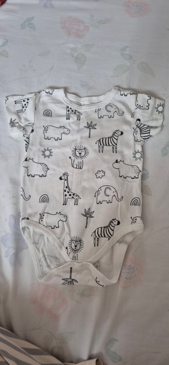 Pamuklu beyaz bebek body, kısa kollu ve yuvarlak yakalı, hayvan desenleriyle rahat ve sevimli. Leke tülerme defosu yoktur. 2 adettir