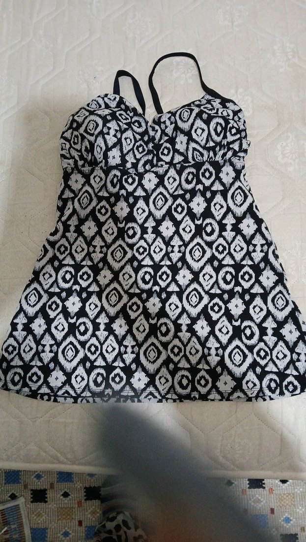 Siyah beyaz desenli, ince askılı, volan detaylı bohem kesim, midi uzunlukta kadın mayo. Günlük kullanım için uygundur.