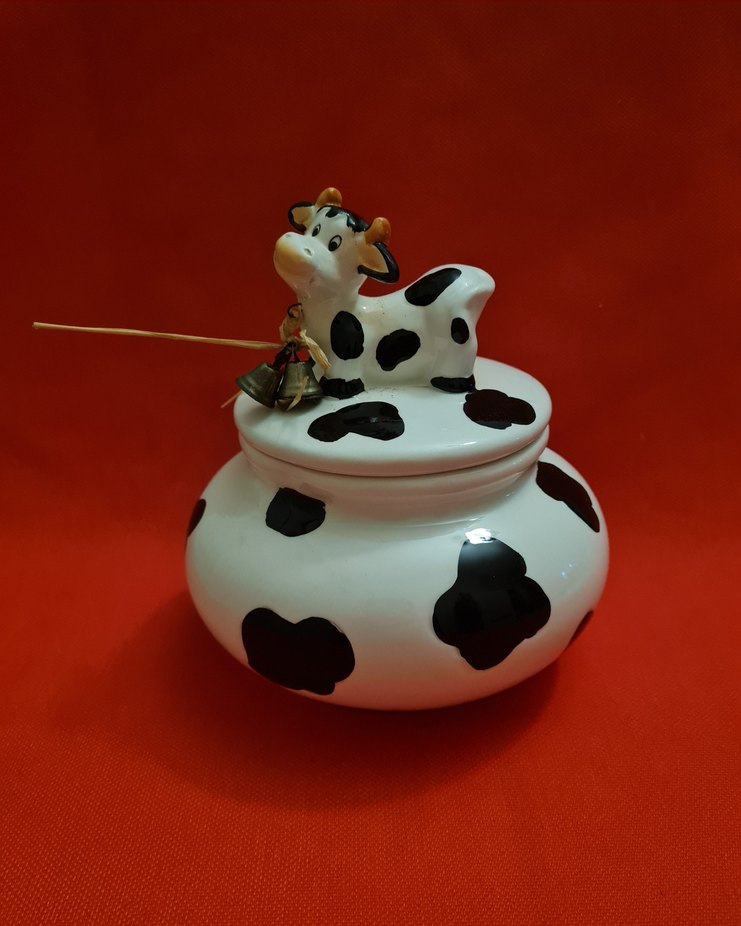 Üzerinde inek figürü bulunan, siyah beyaz desenli renkli seramik kavanoz. Kapaksız 10 cm ,kapaklı 18 cm boyunda. Ağız çapı 10 cm , gövde genişliği 47 cm. Ufak tefek kullanıma engel olmayan sorunları var. Resimlerde göstermeye çalıştım. Dikkatli incelemenizi rica ediyorum. İhtiyaç fazlası olduğu için satıyorum. #kavanoz #vintage