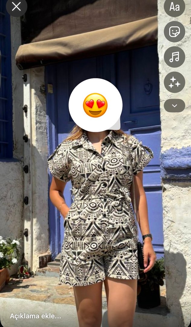 Siyah Beyazdesenli, kısa kollu, yakalı ve düğmeli, bol kesim kadın tulum. Sokak stiline uygun, dış mekan kullanımı için ideal.