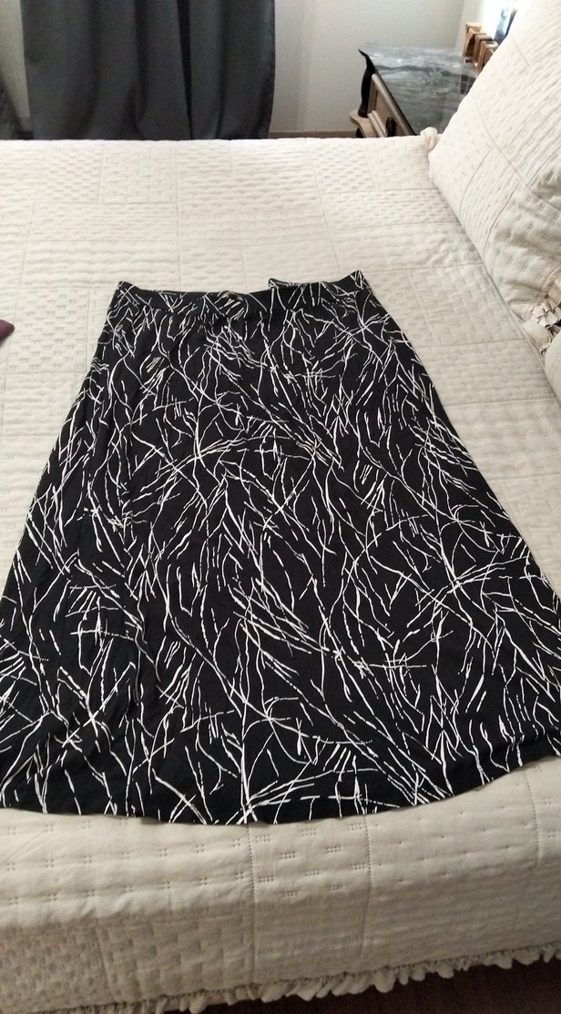 Siyah renkli, beyaz soyut desenli, bol kesim midi boy etek. Yumuşak sentetik kumaştan, dış mekan kullanımı için uygun.