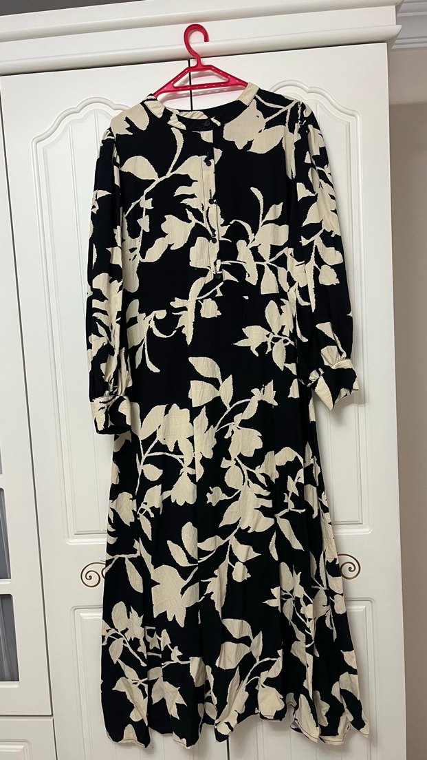 Siyah uzun elbise, bol kesim, yüksek yaka ve uzun kolludur. Dökümlü silueti ve büyük çiçek desenleriyle bohem Paris tarzını yansıtır. Pürüzsüz sentetik kumaştan üretilmiştir, günlük kullanım için uygundur.