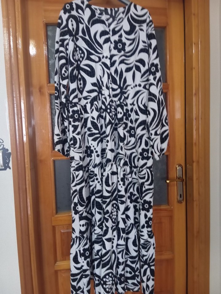Siyah beyaz desenli, uzun ve bol kesim bohem elbise. Uzun kollu, ve dökümlü tasarıma sahiptir. Günlük kullanım için uygundur. önden gizli düğmeli kolları lastikli beli oturtmalı