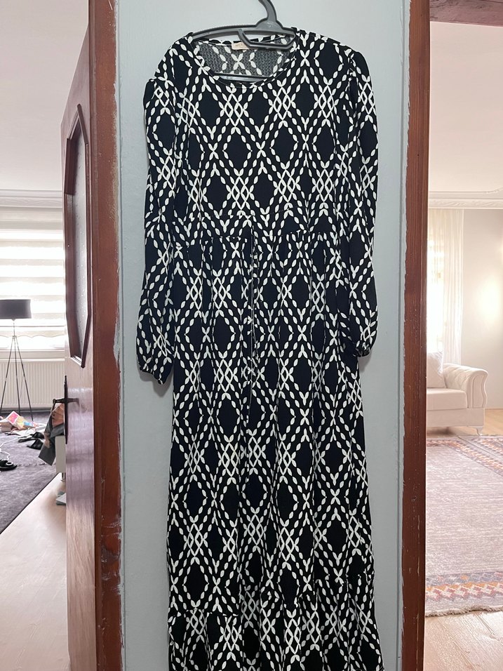 Siyah beyaz desenli, bol kesim, uzun bohem elbise. V yaka, günlük kullanıma uygun.