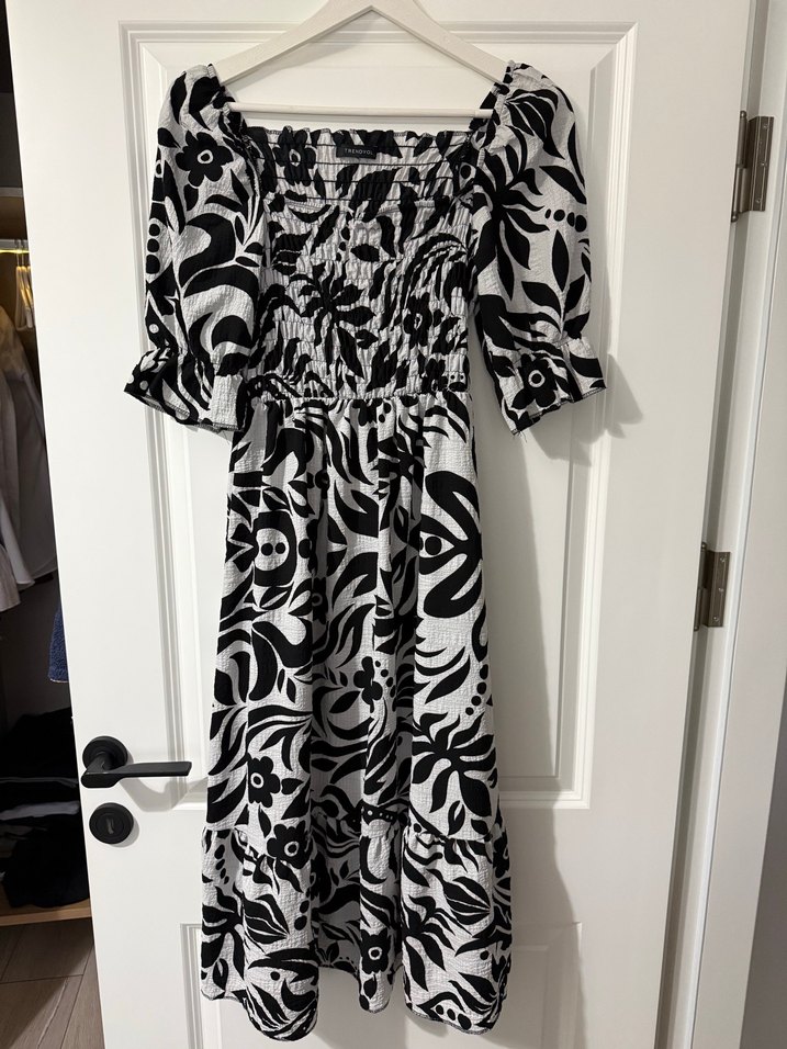 Uzun, bol kesim siyah beyaz desenli elbise, fırfırlı ve kısa kolludur. Teknolojik sentetik kumaştan, bohem tarzında ve kayık yaka şeklindedir. Romantik ni elbise midi boy yazın çok güzel oluyor 36beden