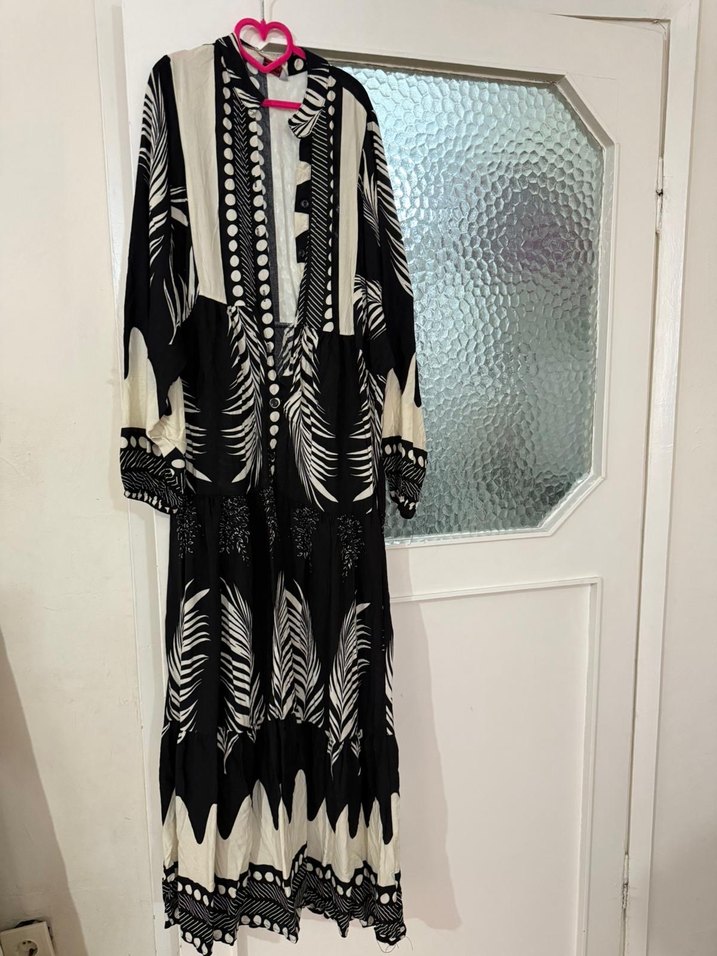 Siyah beyaz desenli, sentetik kumaştan uzun elbise. V yaka, uzun kollu, bol kesim ve drapeli bohem tarzda, günlük kullanım için uygundur. Hiçbir hasarı yok 2 kez giyildi