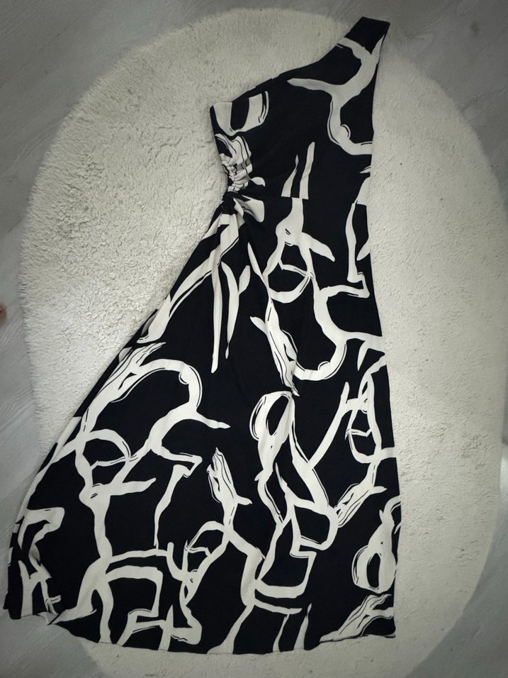 Siyah Beyaz Desenli Uzun Drapeli Elbise
