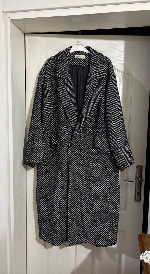Siyah beyaz zigzag desenli uzun kaban, geniş yakalı ve rahat kesimlidir. İç kısmı yumuşak astarlıdır, konfor ve sıcaklık sağlar. 118 cm