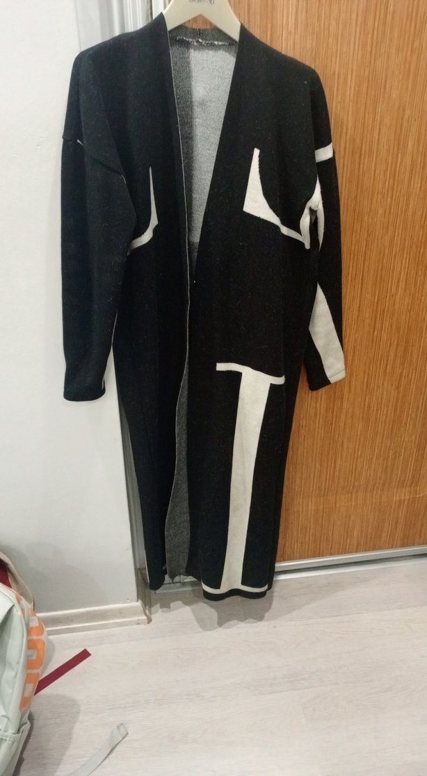 Siyah beyaz desenli, uzun kesim kadın kaban. Notlu yaka, uzun kollu ve yırtmaç detaylı, sentetik kumaştan üretilmiştir.