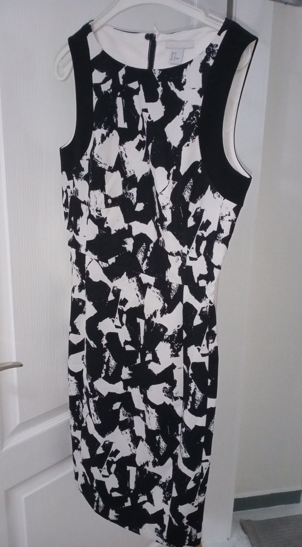 Kolsuz, v yaka, siyah beyaz baskılı uzun kalem elbise. Sentetik kumaştan, sokak stiline uygun şık ve modern tasarım.