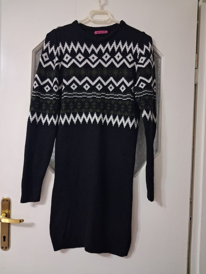 Siyah uzun örgü kazak, beyaz desen detaylarıyla. Dar kesim, uzun kollu ve bisiklet yaka özellikleriyle gündelik sokak stiline uygun. esnektir 40 bedene kadar rahatlıkla olur