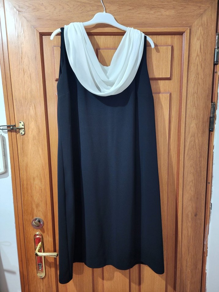 Kısa siyah kadın elbise, beyaz drapeli kayık yaka ve kolsuz tasarımla minimalist gotik tarz sunar, ofis kullanımı için uygundur.