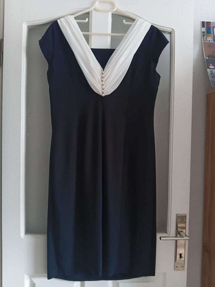 Siyah, vücudu saran midi uzunlukta, beyaz drapeli kayık yaka ve kolsuz tasarıma sahip minimal ve şık gotik stilde elbise, ofis için uygun.