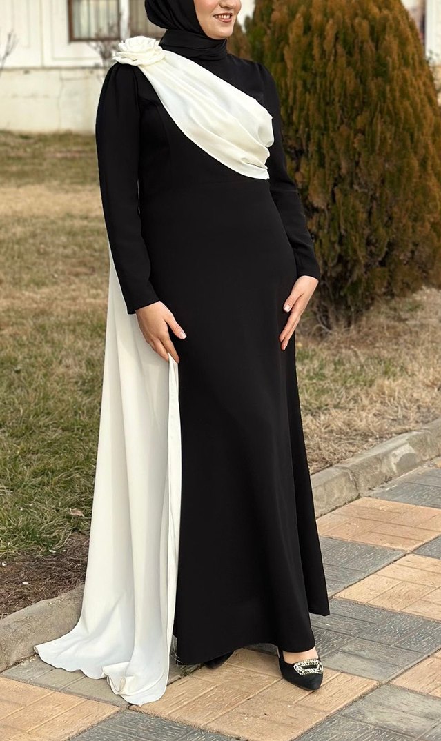 Siyah Beyaz Drapeli Uzun Kadın Abiye Elbise