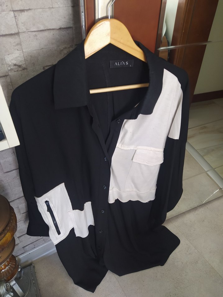 Pamuk kumaştan, siyah beyaz renklerde, düğmeli ve kısa kollu, yakalı, bol kesim street wear gömlek. Fermuarlı ve kapaklı cep detayları vardır. Marka: ALIAS.