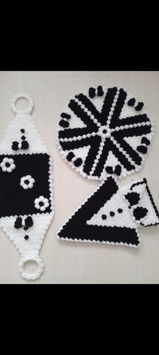 Siyah beyaz, geometrik desenli el örgüsü dekoratif parçalar içeren set, mekânınıza geleneksel bir dokunuş katmak için uygundur.