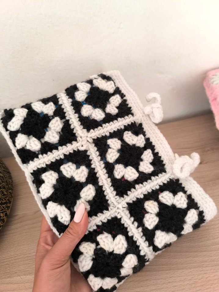 Siyah beyaz örgü kitap çantası. Farklı renklerde sipariş üzerine örülür. ️