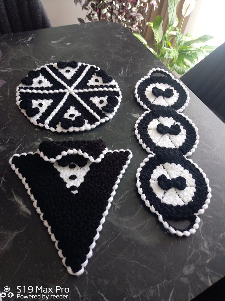 Geometrik ve kalp desenli siyah beyaz el yapımı örgü parçalarından oluşan dekoratif set.