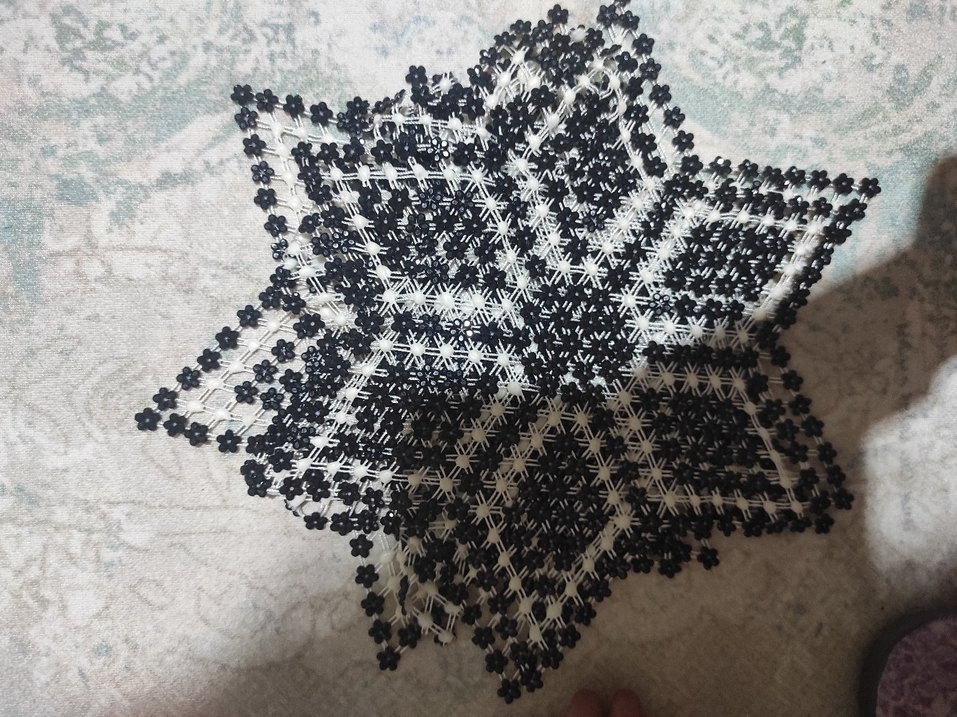 Siyah ve beyaz yıldız desenli, el yapımı dantel örtü, geleneksel el işçiliği ile detaylı şekilde hazırlanmıştır.