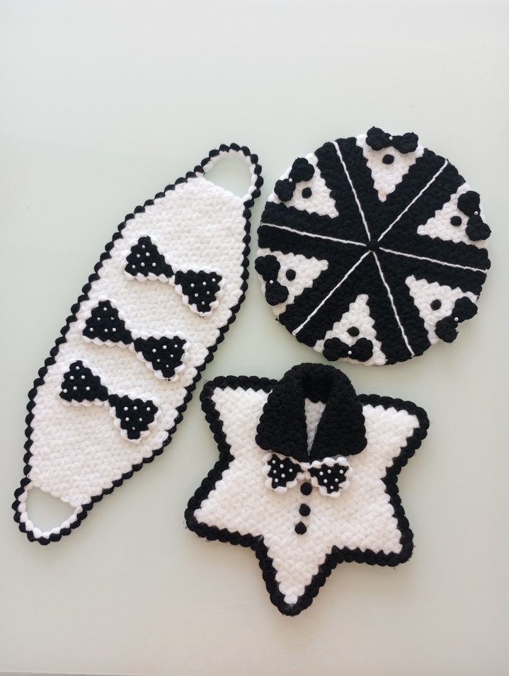 El yapımı siyah beyaz örgü banyo seti; yakalı papyonlu yıldız, üçgen desenli yuvarlak ve üç papyonlu uzun parçadan oluşur.