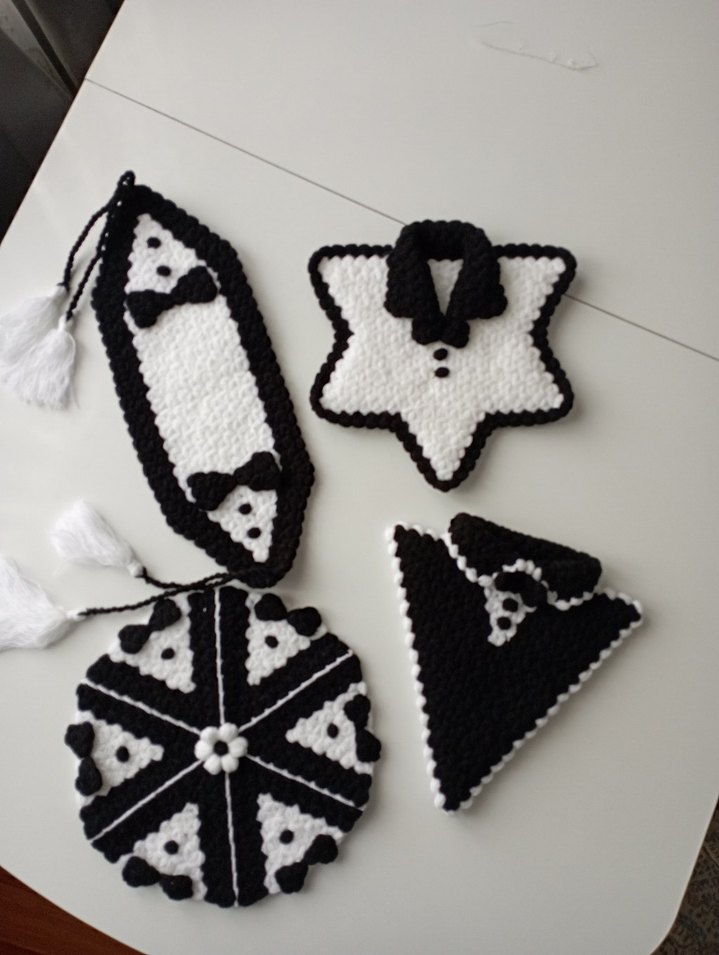 Siyah ve beyaz renklerde, çeşitli geometrik ve klasik desenlere sahip dört adet el yapımı örgü supladan oluşan set.