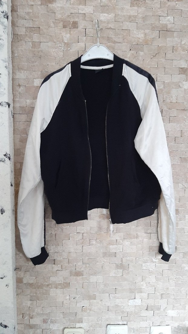 Kadın ceket, uzun kollu ve notlu yaka detaylıdır. Fermuarlı ön kısmı, siyah-beyaz renkleriyle midi boyda ve bol kesimdir. Sentetik kumaştan yapılmıştır, günlük kullanıma uygundur.