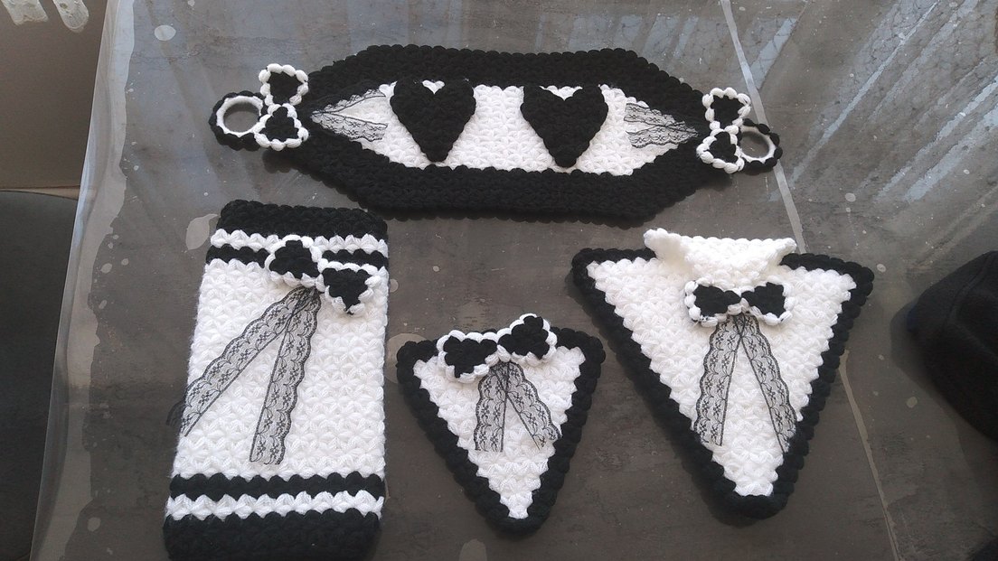 Siyah beyaz renklerde, gotik tarzda kalp ve dantel detaylı el örgüsü dekoratif set.