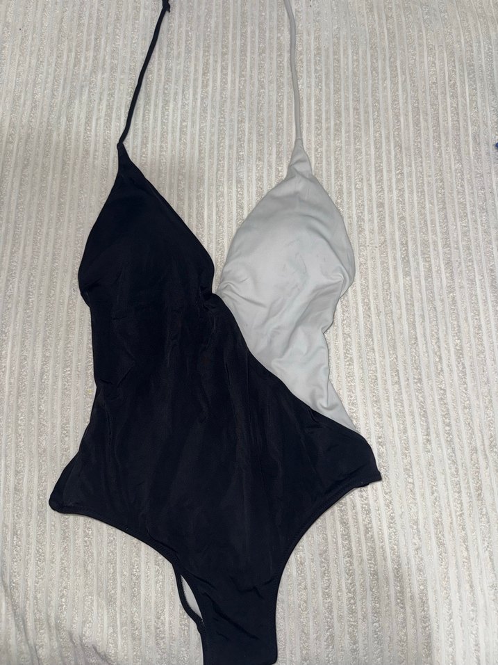 Bu vücuda oturan mayo, siyah-beyaz renk bloklu cesur tasarımı ve ince askılarıyla plajda zahmetsiz şıklık sunar. Minimalist ve gotik stil için uygundur.