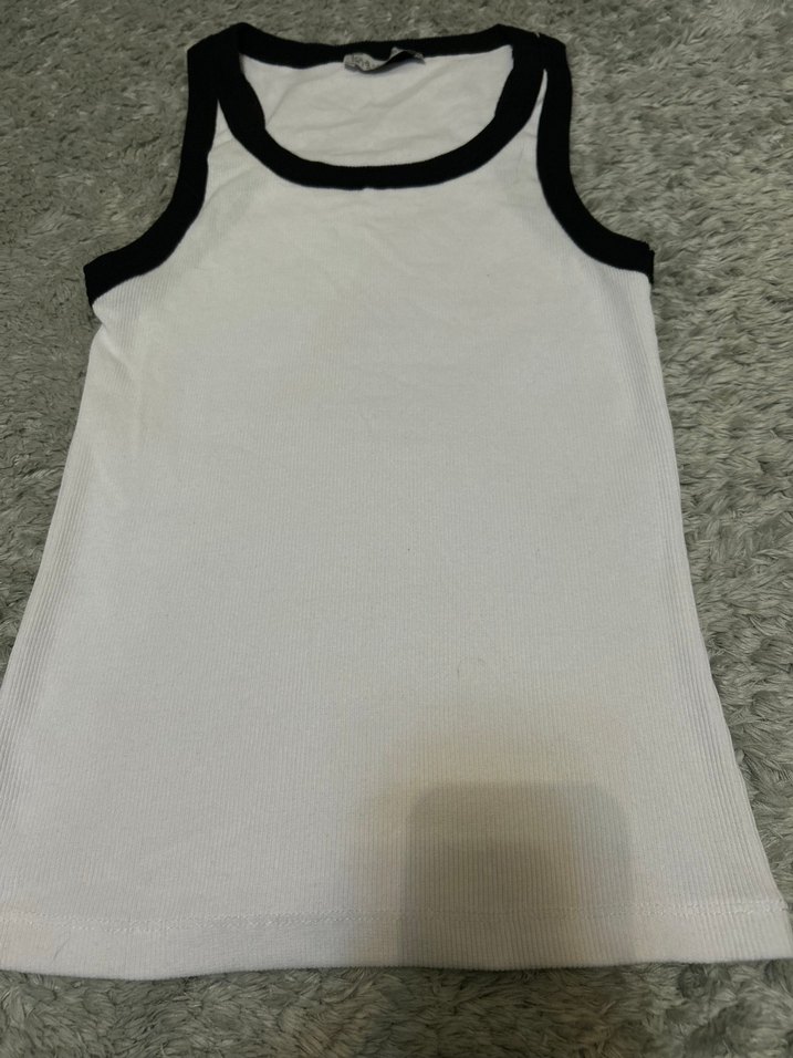 Siyah detaylı beyaz kadın atlet, düz kesim ve yuvarlak yaka ile rahat bir görünüm sunar. Sentetik kumaşı günlük spor ve rahat tarz için uygundur. ♀️