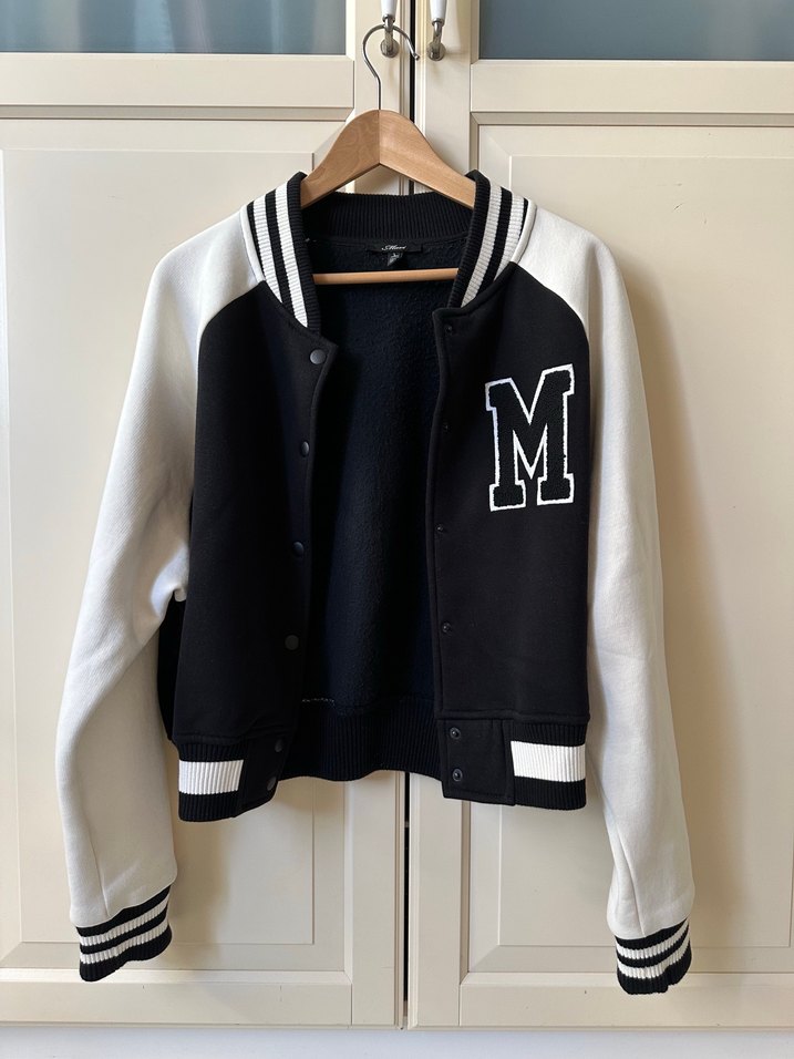 Kadınlar için siyah beyaz, uzun kollu, düğmeli bomber ceket. Rahat kesim, baskılı 'M' harfi ve yumuşak, sıcak kumaştan üretilmiştir. Günlük kullanım için uygundur.
