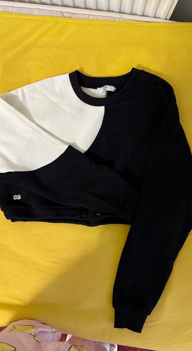 Kadınlar için yuvarlak yaka, uzun kollu ve bol kesim sweatshirt. Yumuşak ve sıcak kumaştan, siyah-beyaz renk bloklu tasarım rahat ve şık. Günlük kullanıma uygun.