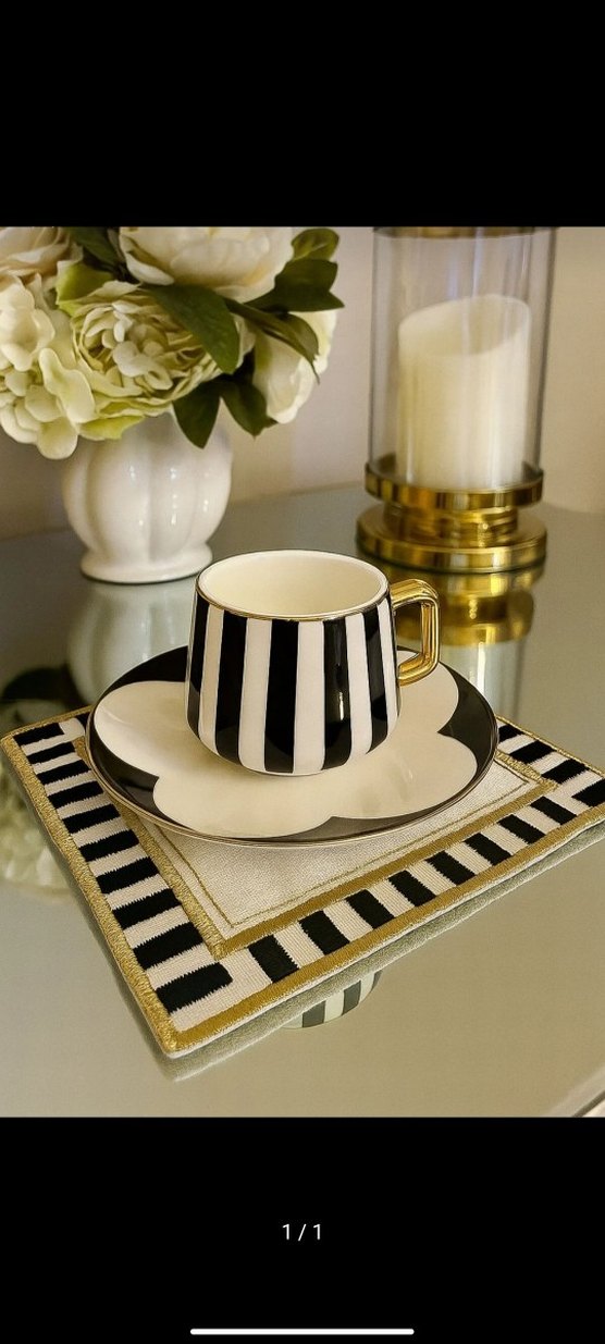 Siyah beyaz dikey çizgili fincan ve tabağın yanında, çizgili kenarı ve altın detayları olan uyumlu bir peçete seti. Şık kahve keyfi için ideal. ☕