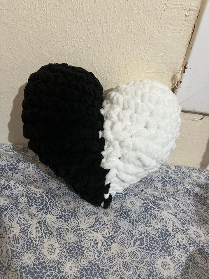 Siyah ve beyaz renklerin kontrastıyla kalp şeklinde yumuşak bir yastık. Her ortama sıcak ve dekoratif bir dokunuş katıyor.