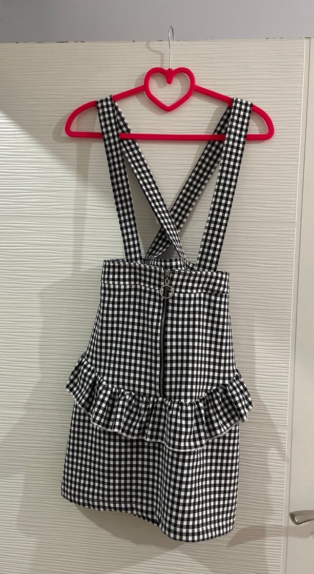 siyah-beyaz kareli, askılı ve fırfırlı, sentetik kumaştan yapılmış, sokak stili tulum. 1 kez giyildi