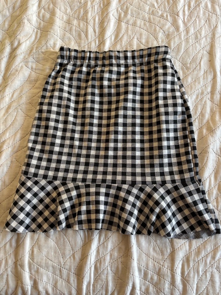 Siyah beyaz kareli, sentetik kumaştan yapılmış, vücuda oturan ve fırfırlı etek. Paris sokak modasını yansıtır. S ve M beden uygun