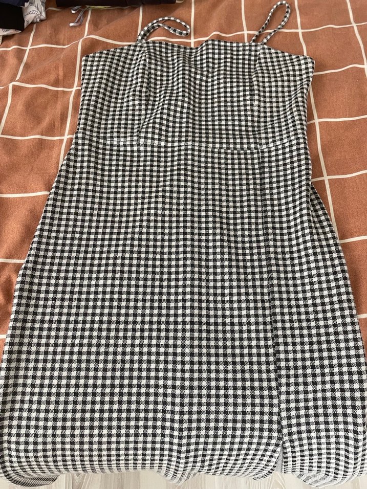 Siyah beyaz kareli, askılı ve tekne yaka midi elbise. Pilili detaylara sahip, sentetik kumaş hissiyle şık ve rahat bir seçim.