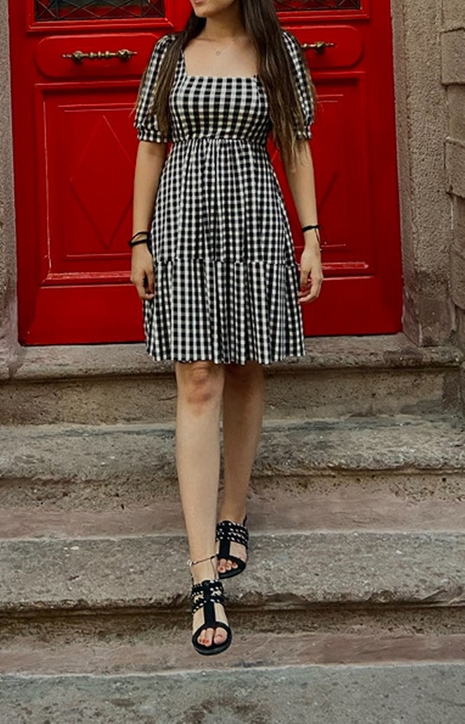 Siyah beyaz kareli mini elbise, tekne yaka ve askılı kollara sahip. Bol kesim ve tokalı detaylı, günlük kullanım için sentetik kumaştan üretilmiştir.