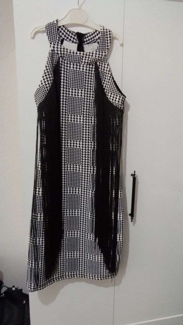 Siyah-Beyaz Kareli Uzun Halter Yaka Elbise