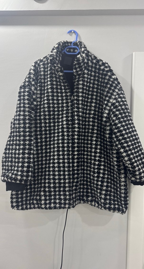 Siyah beyaz kazayağı desenli, peluş dokulu kaban. Kalın ve sıcak tutar, kış ayları için uygundur. İç kısmı astarlı, giyimi rahattır. Çift taraflı görünüm hissi veren dokusu sayesinde dolgun ve şık durur. Kumaşında tüylenme, yıpranma, leke veya sökük yoktur. Temiz, bakımlı ve çok iyi durumdadır. Göğüs en:70 cm Beden boy : 72 cm