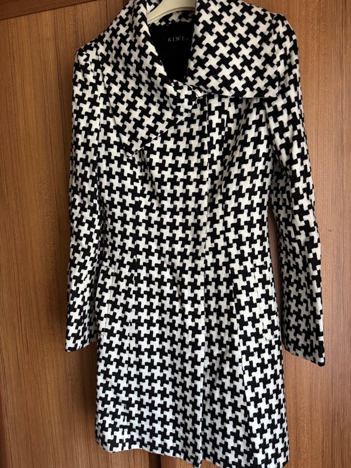 Geniş yakalı, uzun kollu siyah beyaz kaz ayağı desenli kadın kaban, soğuk havalar için şık bir seçenek. Gzia mağazasından alınmıştır. Çok şık bir kaban- ceket formu.