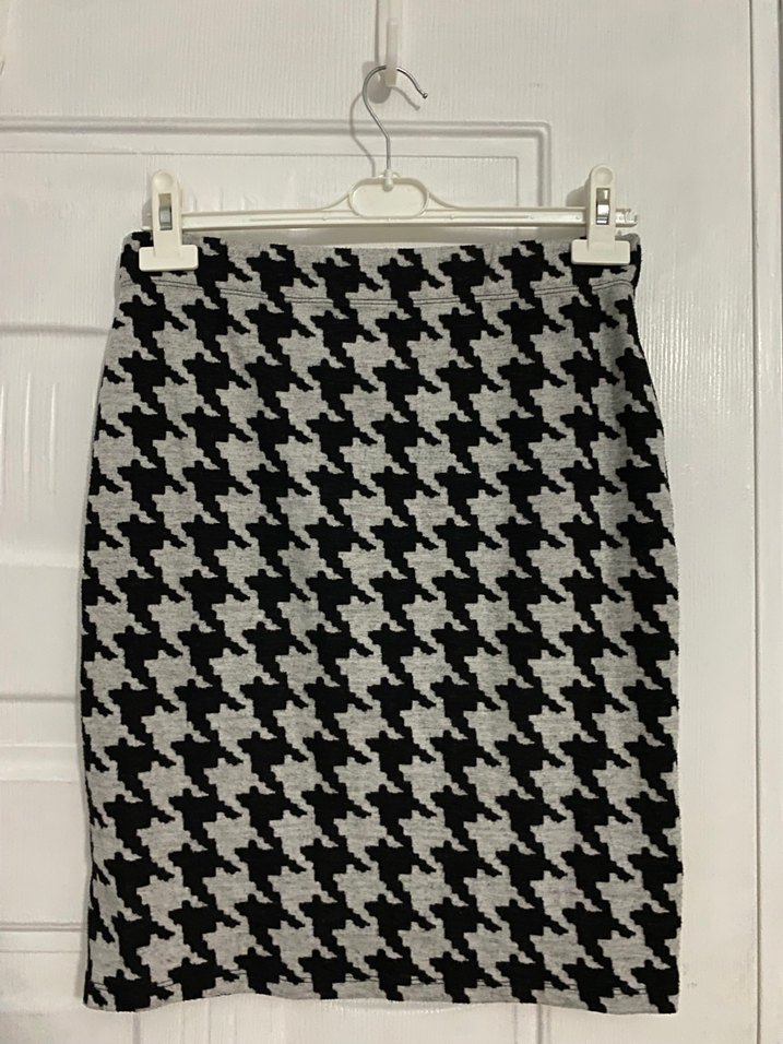 Bu oturan kesim midi etek, siyah beyaz kazayağı deseni ve kemer detayı ile ofis ve sokak stiline uygundur.