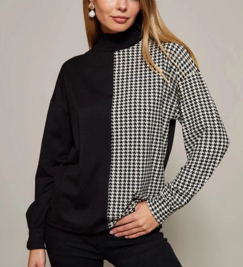Yarım boğazlı, uzun kollu, siyah ve beyaz kazayağı desenli kazak. Örgü görünümlü sentetik kumaştan, rahat ve salaş kesimle günlük kullanım için uygundur.