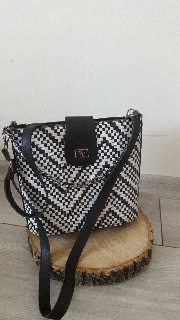 Siyah ve gri zebra desenli, kemerli detaylı kadın çantası. Sentetik kumaştan yapılmış, trend sokak stiline uygun.