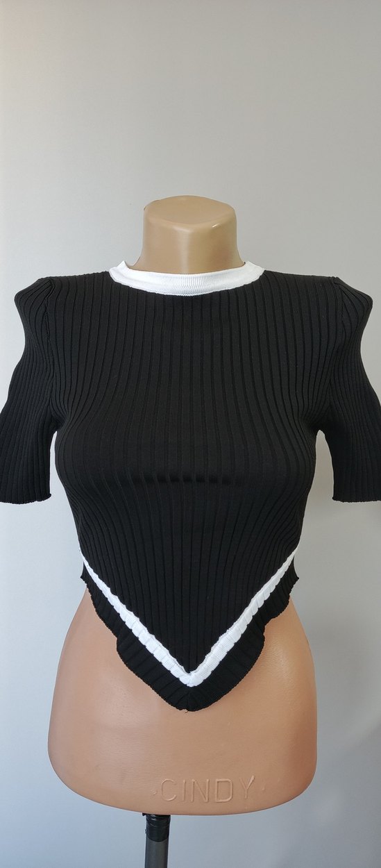 Bu siyah, beyaz kenarlı, kısa kollu, fitted örme kadın kazak, crew neck yakaya sahiptir. Avant-garde ve mini boy tasarımıyla cesur goth stiline uygundur. Standar bedendir.