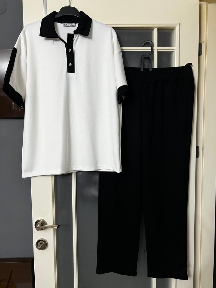 takım, siyah yakalı beyaz kısa kollu üst ve siyah pantolondan oluşur. Regular fit, midi boy ve rahat sokak stili sunar. Yuvarlak yaka ve zahmetsiz şıklık sağlar.