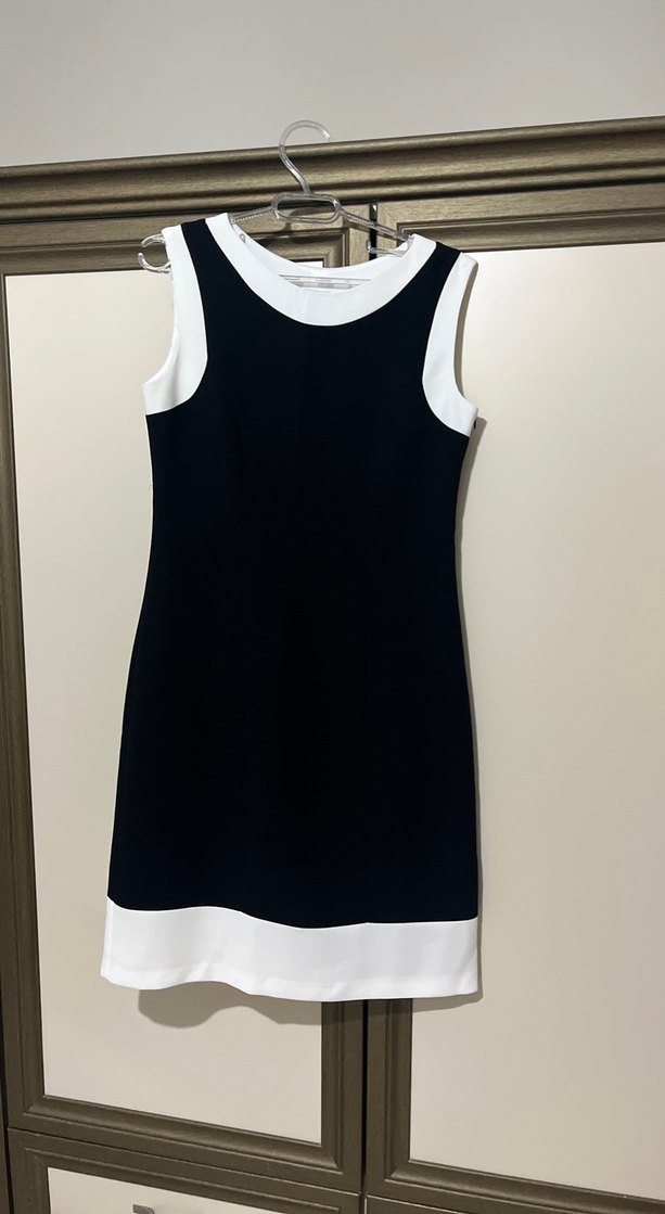 Kolsuz, siyah diz üstü elbise beyaz yaka ve etek ucu detaylarıyla. Yumuşak sentetik kumaştan, minimalist ve günlük sokak tarzı için uygundur. çok küçül lekeleri vardır